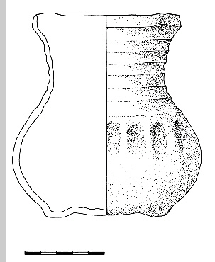 Die Schulter ist durch vertikale ovale Dellen verziert. Typologisch gehört er