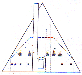 Der ungegliederte rechteckige Baukörper der Brüssower Kirche besaß eine ganz gleiche hohe, den Kehlbalken des Dachstuhls erreichende Deckenschalung wie der vom Langhaus abgesetzte Chorraum in Schmölln. In die zum Innenraum zählende untere Hälfte des Ostgiebels wurden auf einer fast waagerechten Linie fünf oder vielleicht auch sechs Bombentöpfe weitgehend gleicher Machart eingebettet. Sie besitzen anders als die von Schmölln eine gedrungene weitbauchige Form mit niedrigem flach geriefeltem Hals und ausladender, innen gekehlter Randlippe. Ihre Höhe beträgt bei einem Bauchdurchmesser von rd. 20 cm etwa 22 cm. Die Farbe der klingend hart gebrannten Gefäße variiert durch den verwendeten unterschiedlich fetten blauen Ton und eine damals allgemein bevorzugte Brenntechnik, das "Schmauchen", zwischen hellem Grau und dunklem Blaugrau. Wegen der Langlebigkeit dieser für das späte Mittelalter typischen als frühdeutsch bezeichneten Keramik ist eine sehr genaue Datierung einzelner Exemplare leider nicht möglich. In Verbindung mit bauhistorischen Merkmalen ist jedoch als Zeitpunkt der Anfertigung der hier verwendeten Gefäße etwa die Mitte der zweiten Hälfte des 13. Jahrhunderts wahrscheinlich. Mithin wurden sie wohl schon bald nach der Erhebung der Siedlung Borsow oder Brossow zur Stadt als Schalltöpfe in Gebrauch genommen.